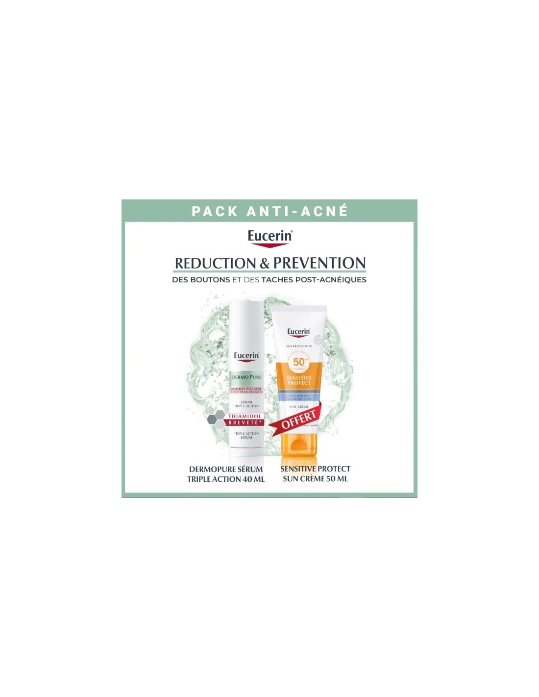 Pack Eucerin Dermopure Triple Effect Sérum 40 ml et Sun Crème SPF50+ 50 ml pour réduire les imperfections et protéger la peau du soleil.